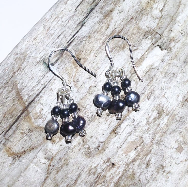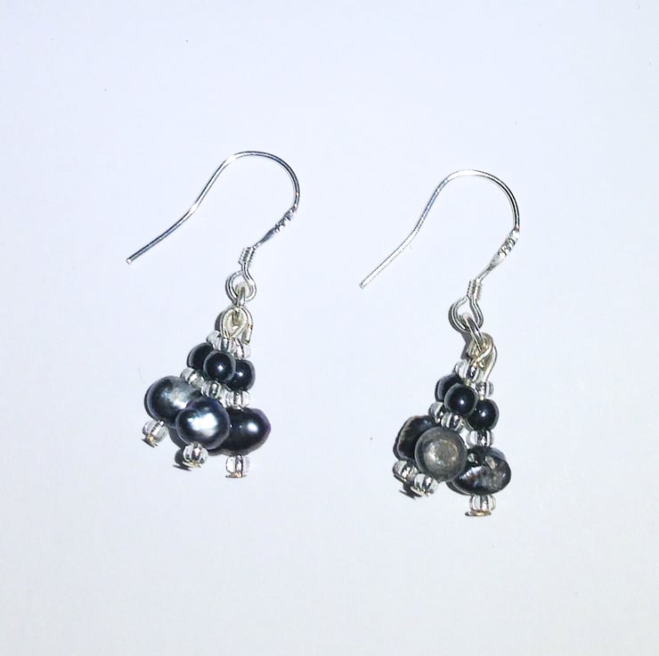 These beautiful earrings are hand made from peacock grey fresh water pearls and other beads made into a lovely cluster of drops.