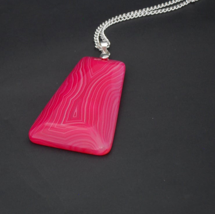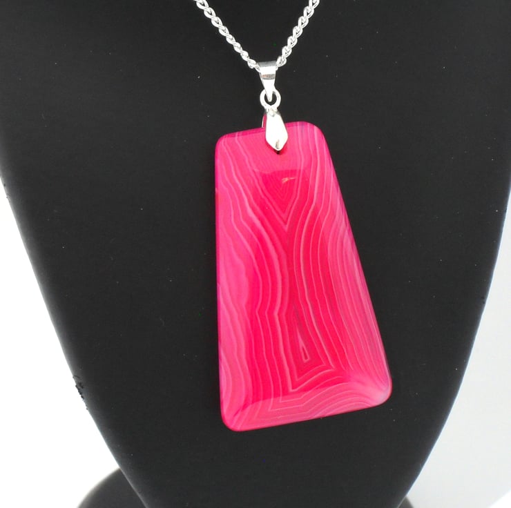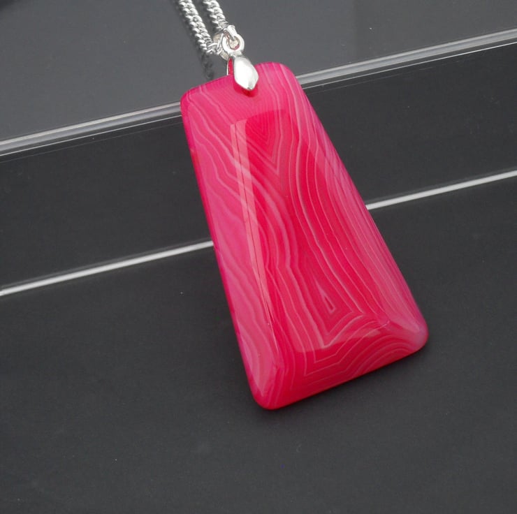 This fushia pink agate pendant is quite stunning. It measures 4.7 cm x 2.7 cms at its widest points, and shows beautiful bandings that are a feature of this semi-precious gemstone.