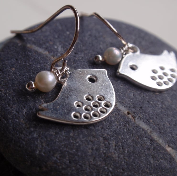 Little bird earrings with tiny ivory freshwater pearls.