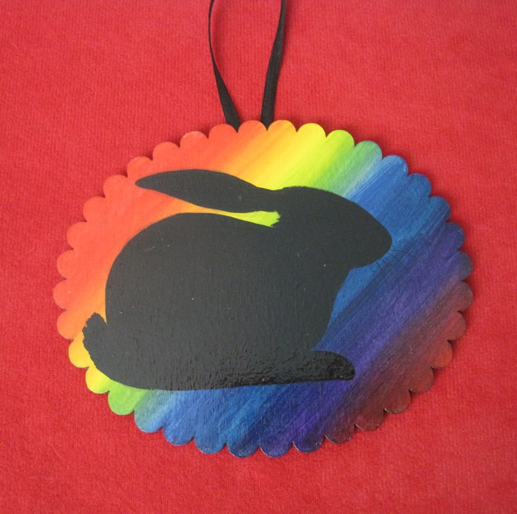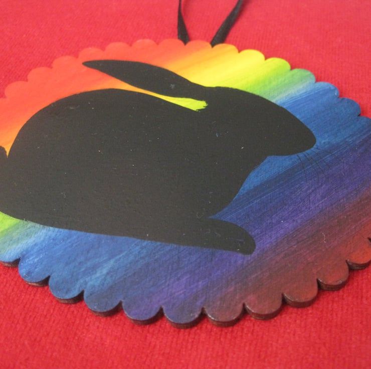 A sweet bunny rabbit hand painted wooden decoration. It features a black silhouette of a rabbit against a background in bright rainbow shades.