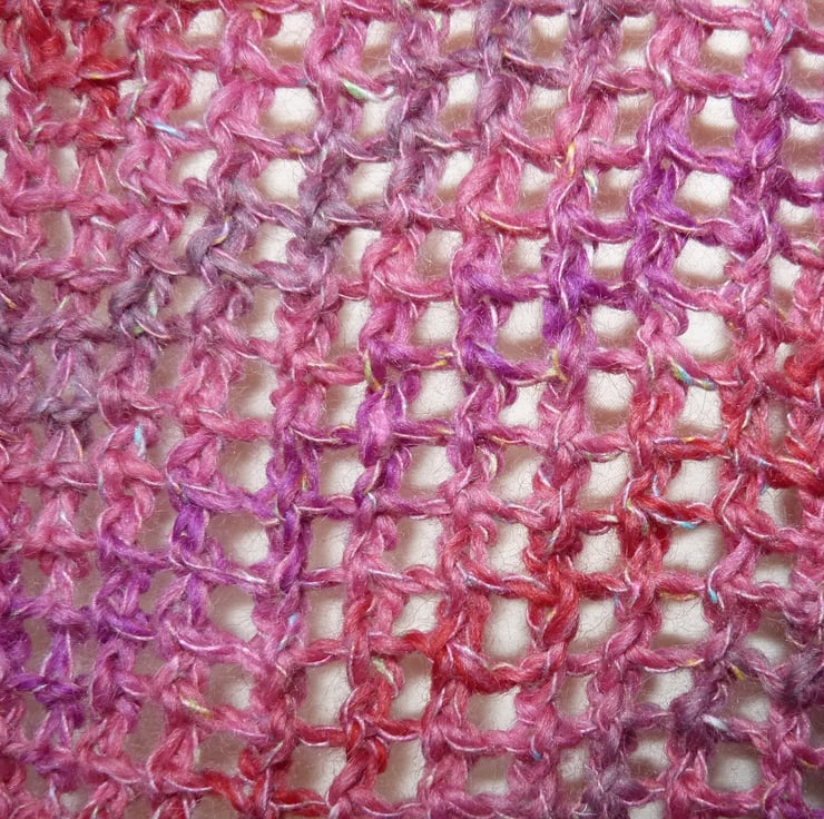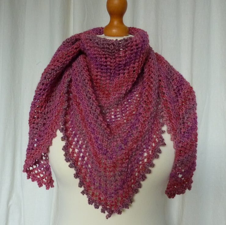I have hand knit this beautiful pink lace scarf in a 4ply Regia Highland Tweed sock yarn. It is a blend of 54% super-wash new wool, 38% viscose and 18% polyamide. It is knitted with an all over lace pattern to give a light scarf with a lovely drape, and has a picot edge. It measures 56" point to point, and is 21" deep at the widest part of the triangle.