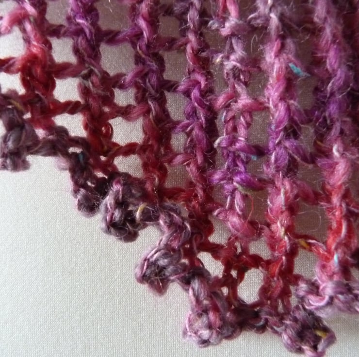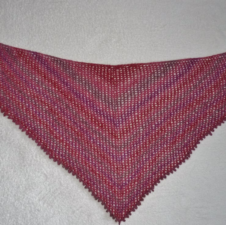 I thought that this yarn would make a lovely scarf, and I have been experimenting with knitting traingular shapes, so this scarf was created