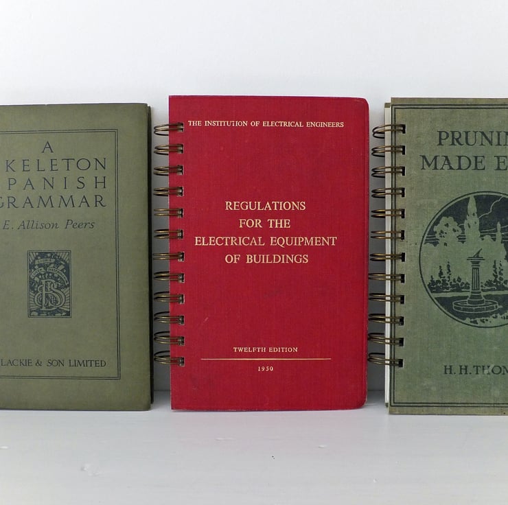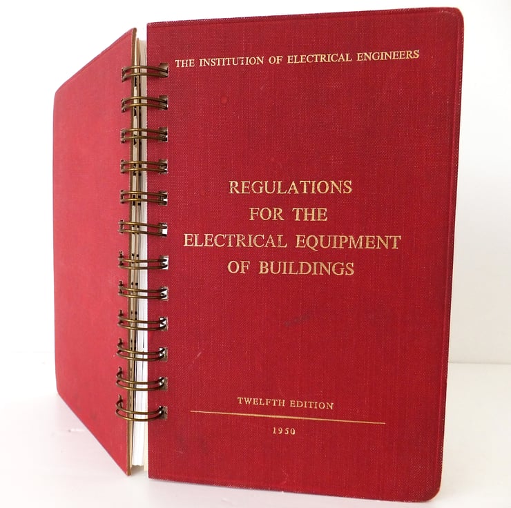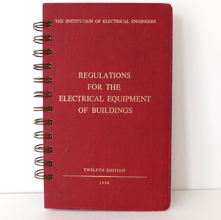 This listing is for the 'Regulations for the Electrical Equipment of Buildings' journal. This spiral bound notebook has been upcycled from a rescued vintage book.