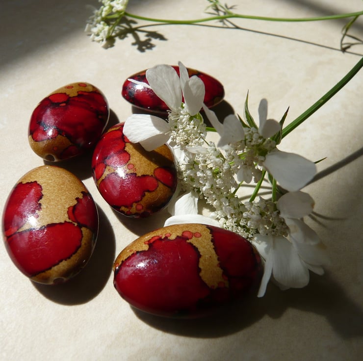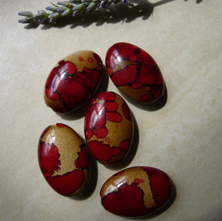 You will receive 5 of what I call splodgy beads, each one has different markings incorporating gold,red and black colours.