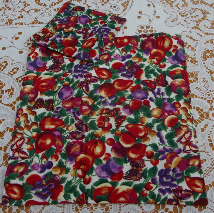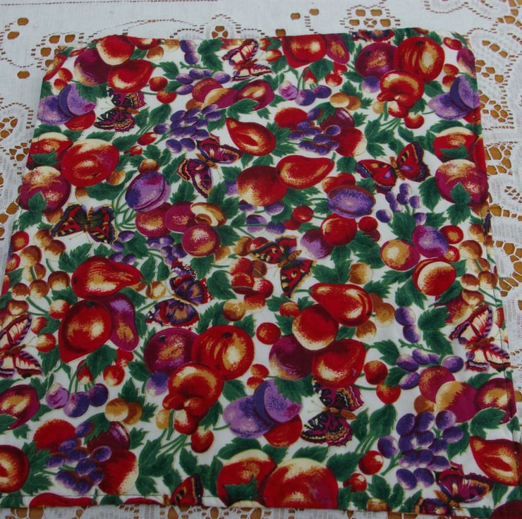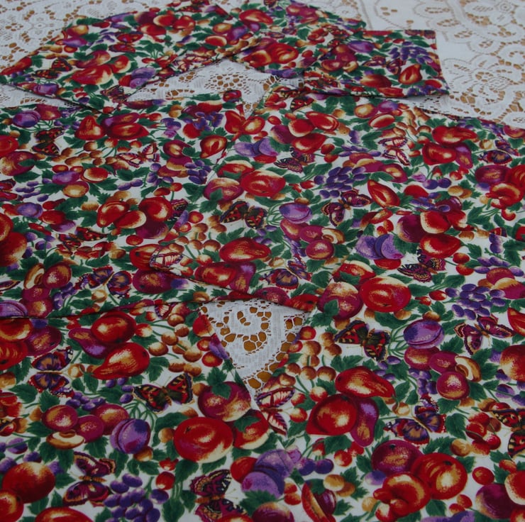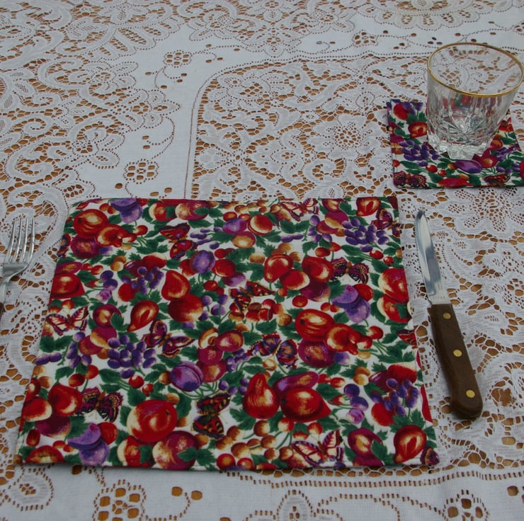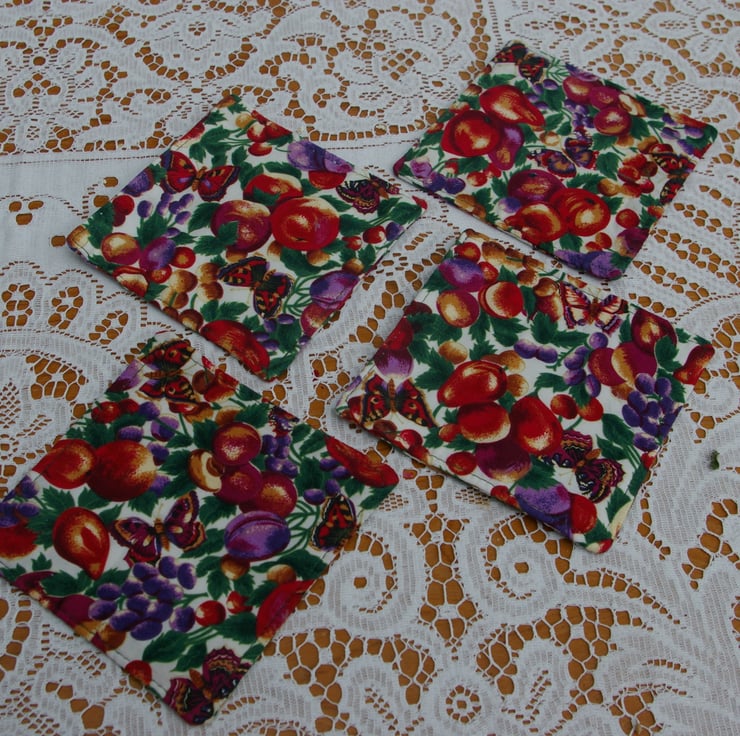 A lovely set of four Place mats and matching Coasters created in colourful cotton material. The pattern on the material is Plums and Butterflies in dark and light purples, golds, reds, and greens on a white background. They are lightly padded with cotton wadding. They would make a great enhancement to any summer table.