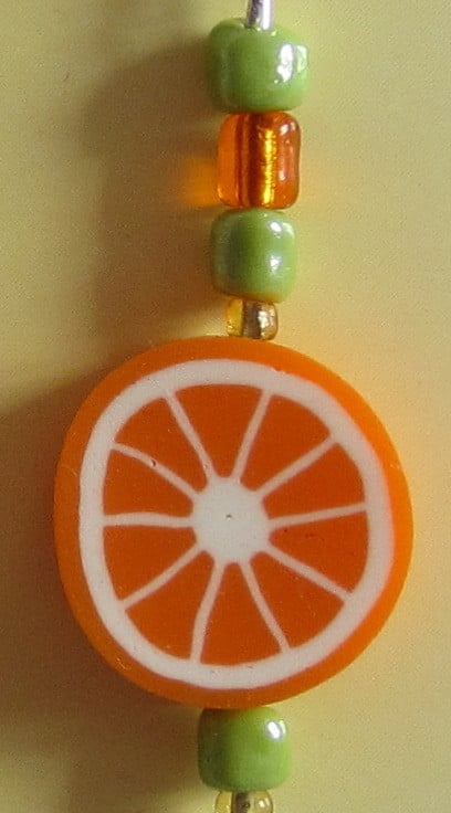 Plastic orange slice bead with green and orange beads on silver plated ear wire. They measure nearly 6 cms from top of ear wire.
