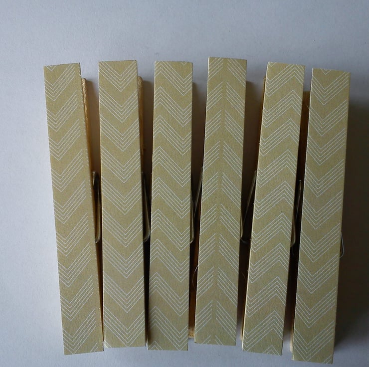 A charming set of 6 decoupaged wooden pegs with magentic strip attached to the back of them.