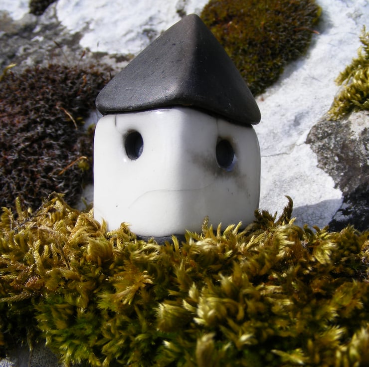 This little house measures 5cm high and 3cm wide. I modelled the shape out of semi-porcelain clay then fired it in an electric kiln, I then painted on raku glaze and fired it in a gas kiln. The roof is unglazed and polished with beeswax.