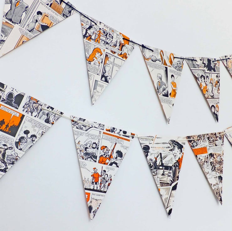 The bunting was designed to be viewed mainly from one side but there are cartoons on both sides so it could be viewed from both sides. It could be hung either against a wall or in the middle of a room. The bunting isn't really suitable for use outdoors – well, it IS paper after all!