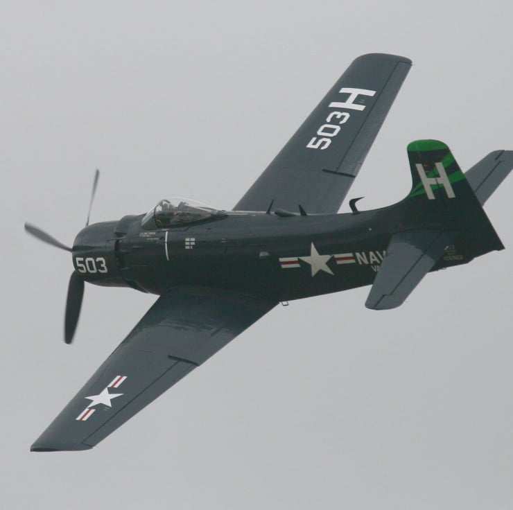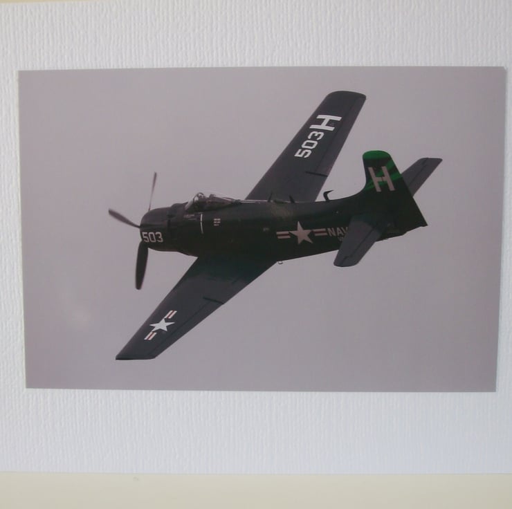 A photo of an American Sky Raider aeroplane, mounted landscape on white textured card with a plain inner left blank for you to write your own message. An envelope is included.