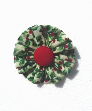 This lovely handmade brooch is made from a Festive fabric and is perfect to wear with any outfit over the festive period. The fabric I have used for this one is a Cream background with Green Holly Leaves and Red Berries. I have attached a brooch pin to the back and has a cover button in the center made with Red fabric