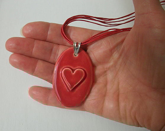 Was £22.00 now £18.50 This necklace set is so gorgeous, glazed 3 times in ruby red and fired twice the large pendant hangs from a sterling silver pronged bail on a 5 corded extender necklace that extends to 18 inches.