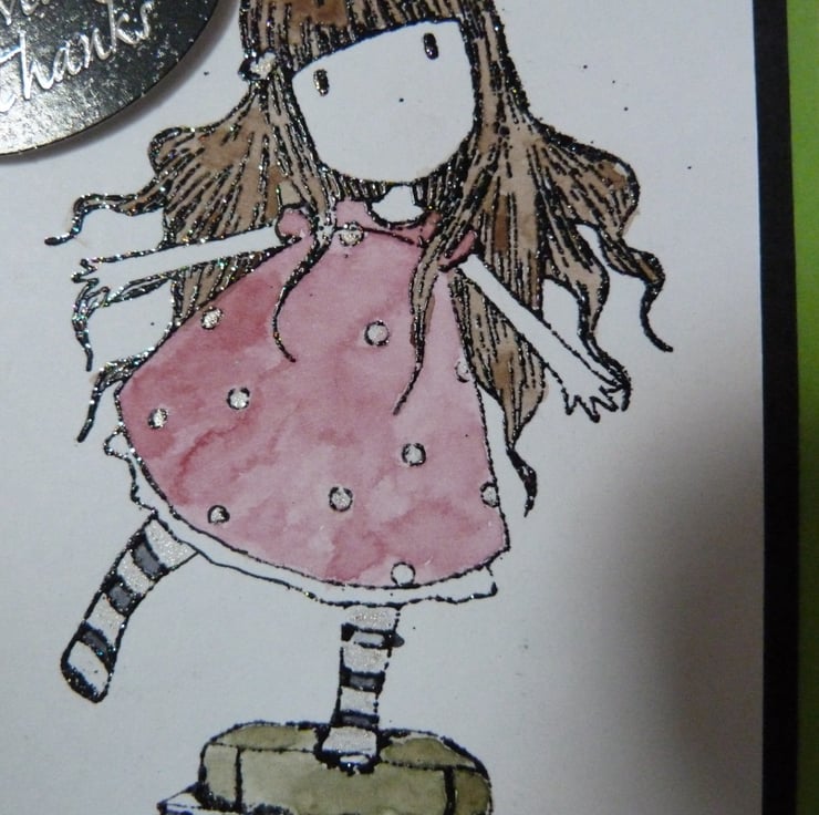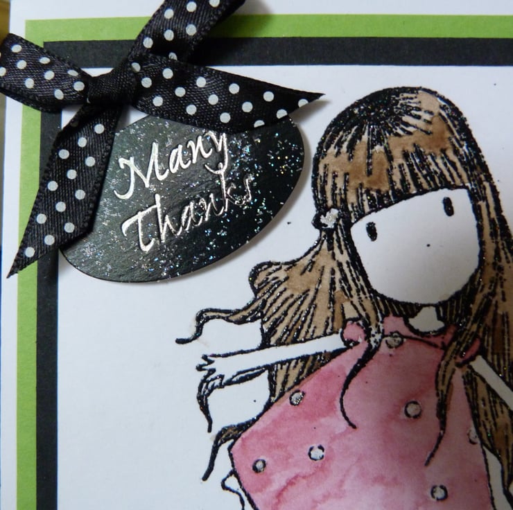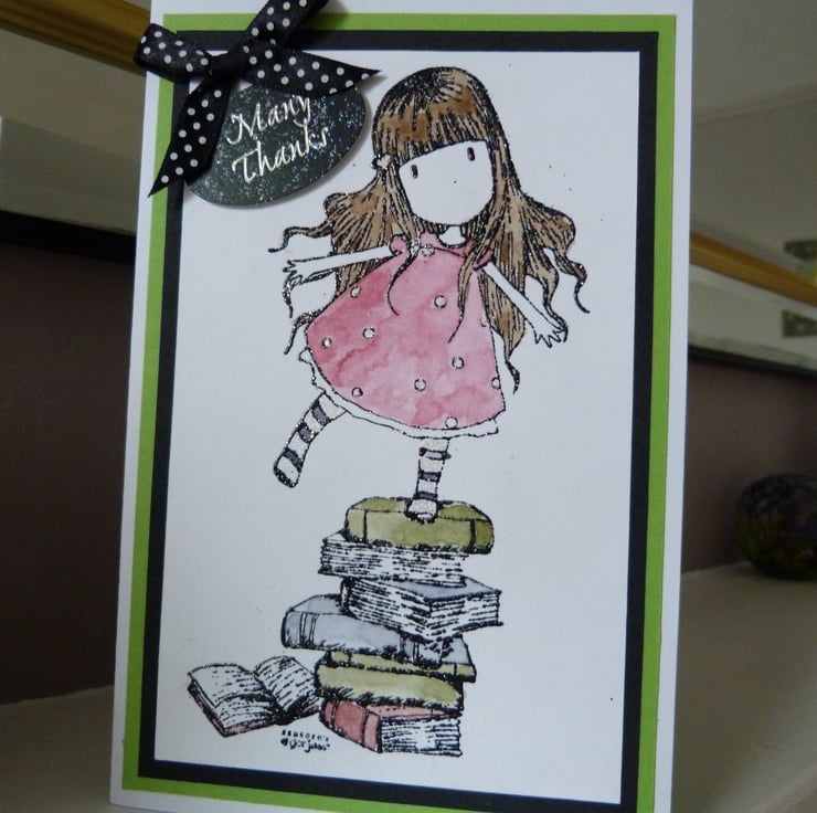 A very cute Gorjuss stamped imaage of a little girl balancing on a pile of books, heat embossed with black glitter and hand water colour painted. Mounted onto black card, then green card and then onto quality white card. Finished off with a Many Thanks tag and a white spotted black ribbon bow.