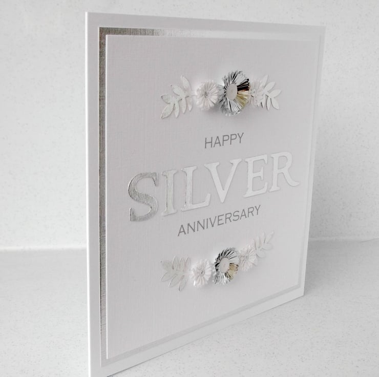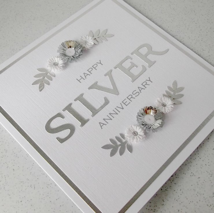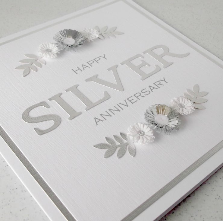 A very special quilled 25th anniversary card with quilling flowers in a striking silver and white colour scheme. Die cut letters in shiny silver spell out the word "SILVER", framed by the words "Happy Anniversary". An original, distinctive handmade greetings card to celebrate a milestone anniversary.