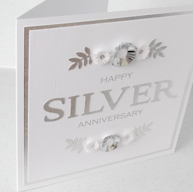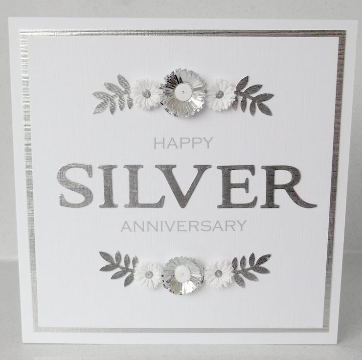This 25th anniversary card measures 5.5" x 5.5" approx. It will be supplied with a quality envelope, in a protective cellophane sleeve. All cards are packaged carefully to ensure they arrive in pristine condition. As I make all my cards individually, the card you receive may differ very slightly from the photograph. However all cards are made to the highest standards and only high quality materials are used.