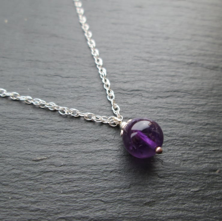 A simple yet elegant purple necklace featuring a single stone of amethyst hung from a sterling silver (925) chain in your choice of 16 or 18” (please state preference upon purchase). It would suit everyday or eveningwear and would make a lovely gift for collectors of semi precious stone or admirers of handmade jewellery.