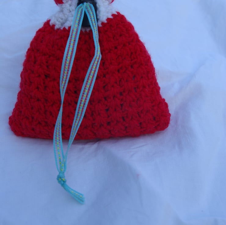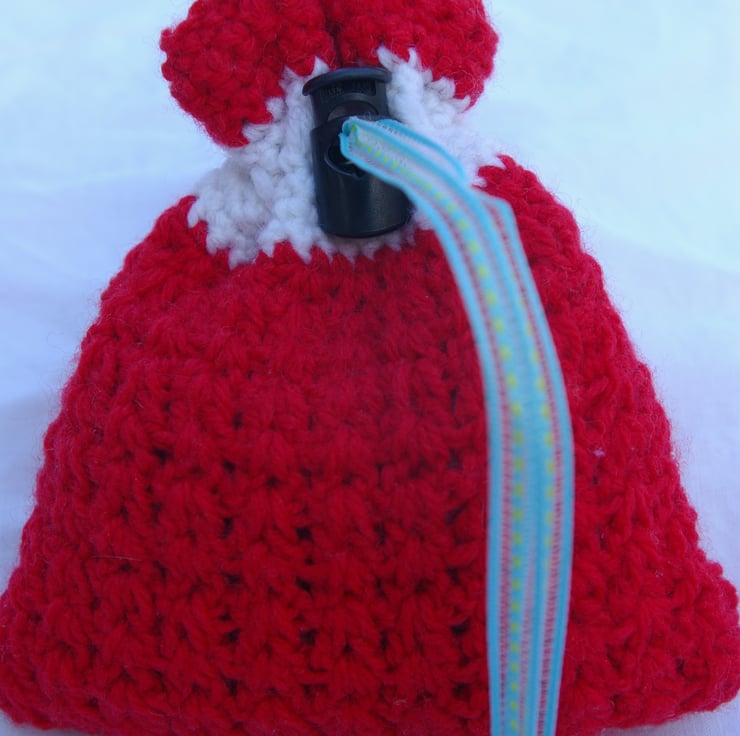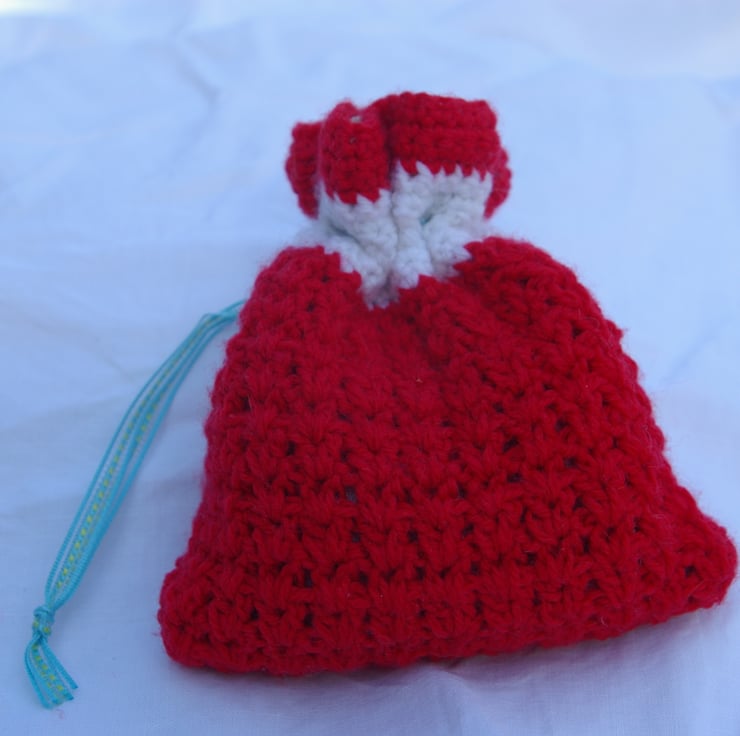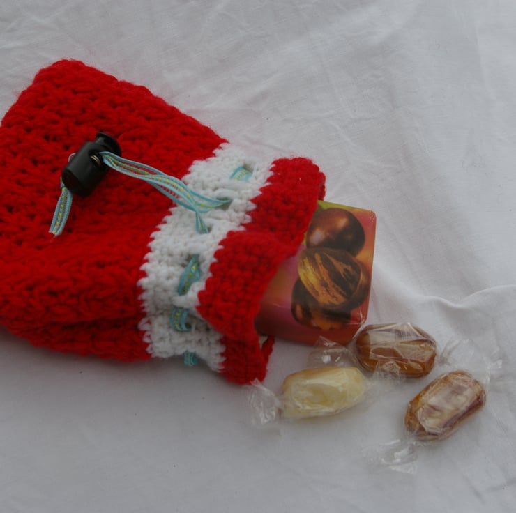 This small crochet gift bag is made with red and white acrylic yarn. It is fully lined in a cotton green and white checked material. It has a green and blue ribbon and black spring toggle to keep your items safe inside. This little bag is just the thing to pop a little present into and place under the Christmas tree for someone special.