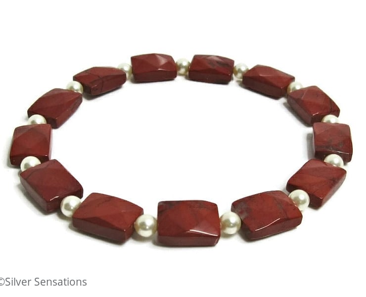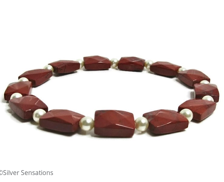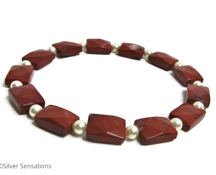 This stretch bracelet is made with faceted Red Jasper oblong beads which are 11mm x 8mm in size.
