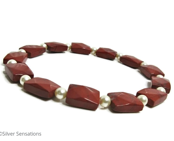 Faceted Brown Red Jasper Oblong Beads & Cream Swarovski Pearls Bracelet