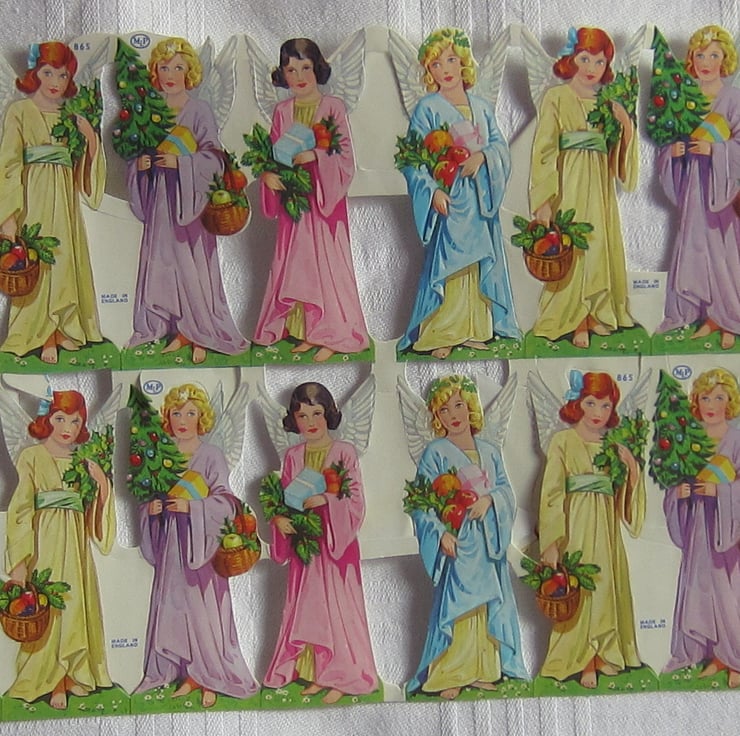 2 sheets of vintage 1950/60's Christmas angels scraps. Unused and in lovely condition. Useful for card making, crackers and other Christmas crafts. Pack includes 2 sheets, one of each design. Each sheet measures about 16 x 24 cms.