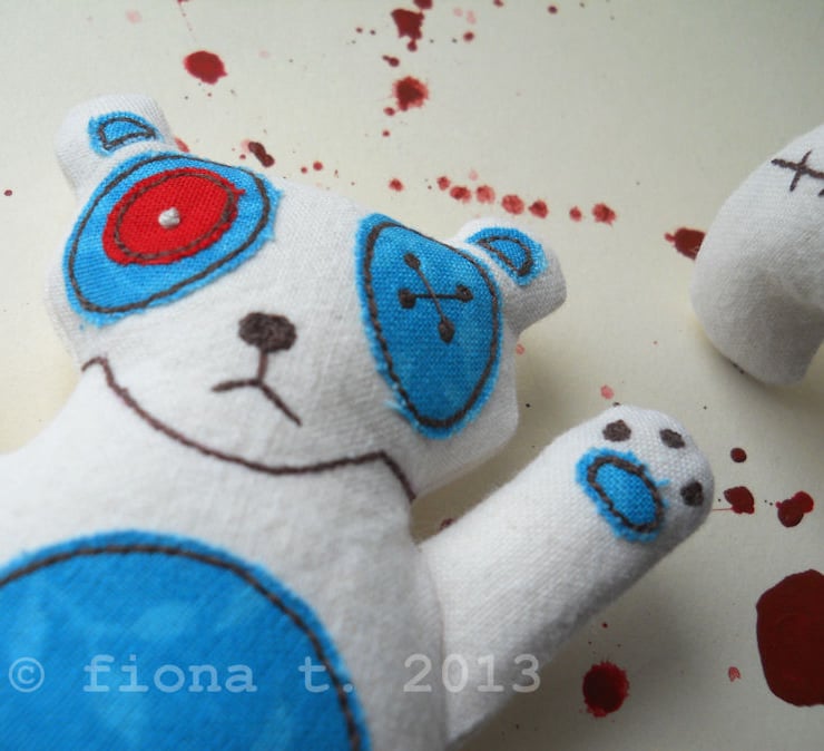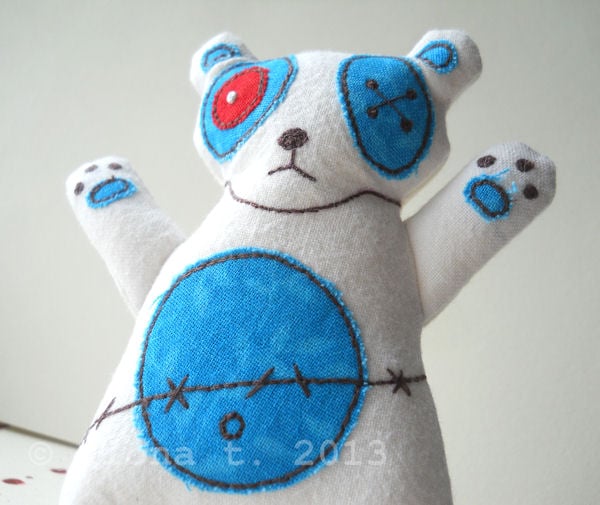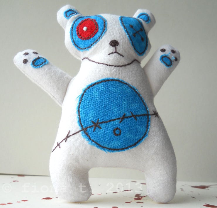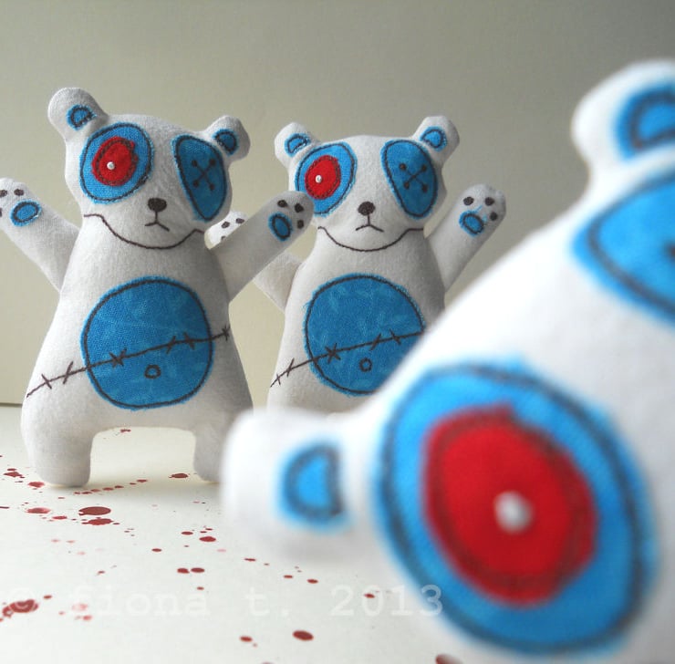 these zombie pandas are made entirely on a domestic sewing machine. everything is cut, stitched & drawn freehand by me, ensuring it is unique, well made and securely constructed.