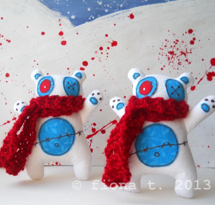 they each wear a red hand knit woolly scarf - zombie pandas need to keep warm.