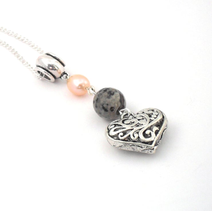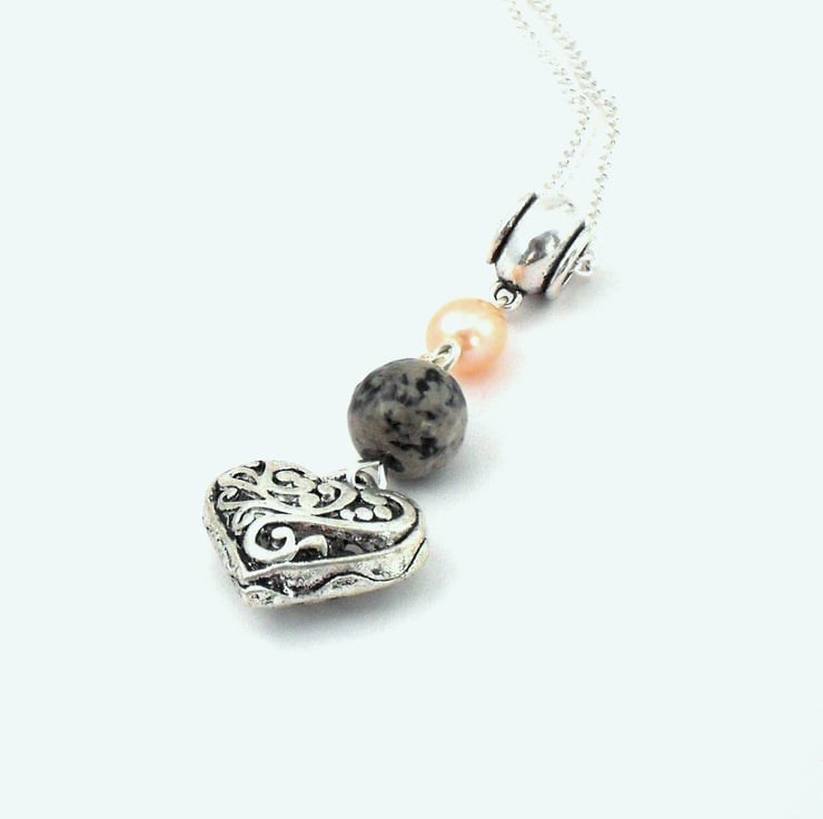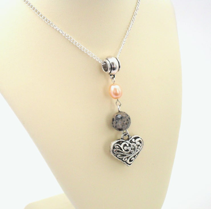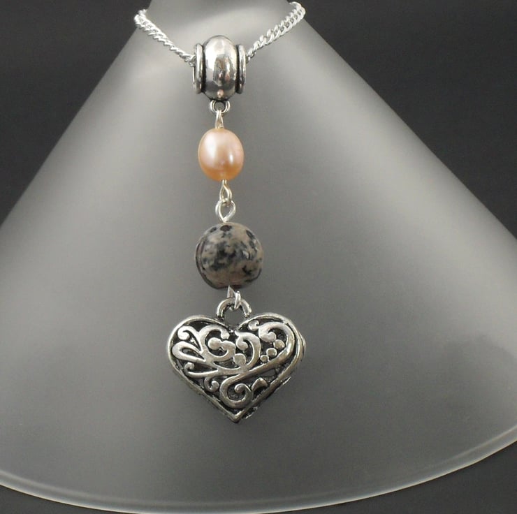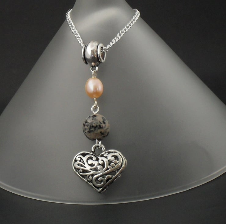 A delicate peach pearl looks great with a most unusual brown fire agate semi-precious gemstone, completed with the addition of a chunky tibetan heart charm.