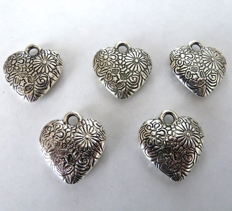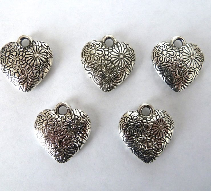 A set of 5 acrylic heart charms which have a metal effect with a embossed pattern on both sides.