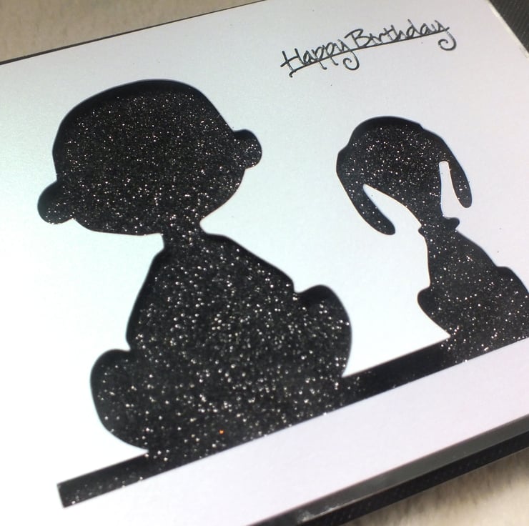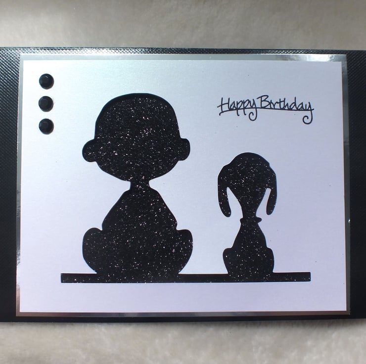 Snoopy and Charlie Brown are timeless characters, and are loved by many people. This card is A5 in size, and I have die-cut their silhouettes using white centura card which has a pearlescent finish. The silhouette background is black glitter, which has been matted and layered onto silver mirri and black embossed card stock. The insert includes the sentiment, 'Happy Birthday!'.