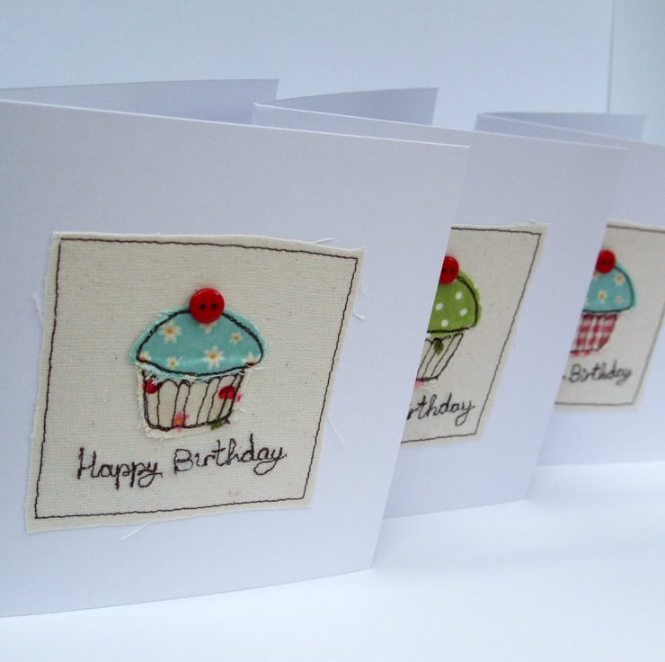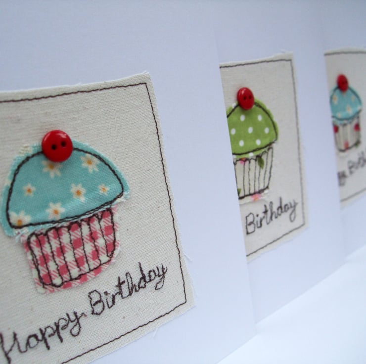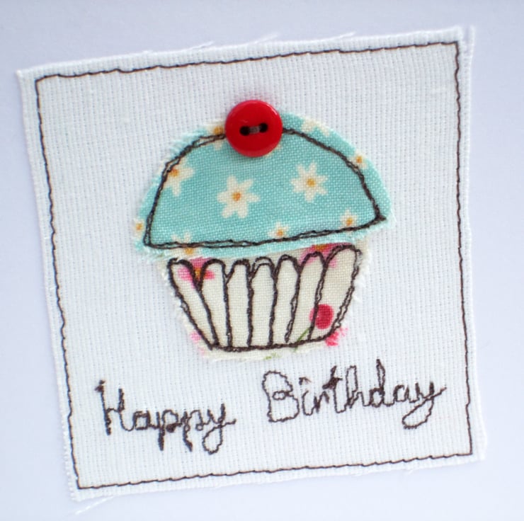 This cute little cupcake has been machine embroidered onto the card and finished off with a button cherry and a birthday message creating a delightful birthday card for someone special.