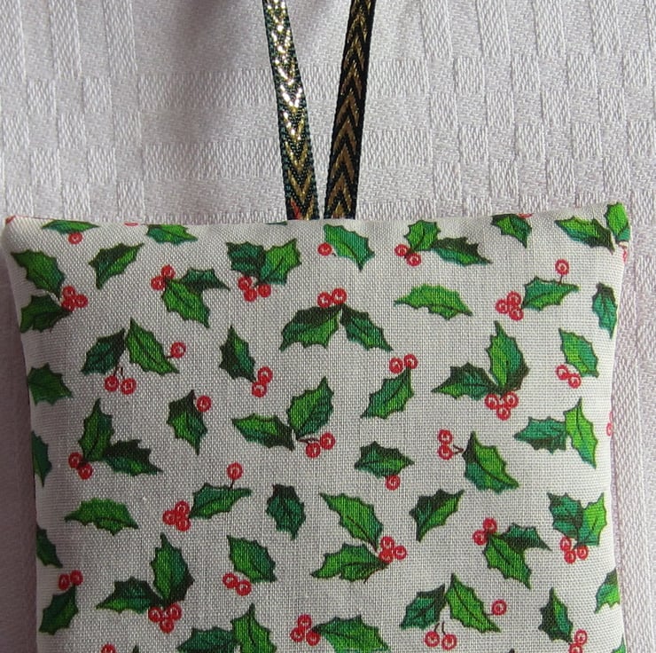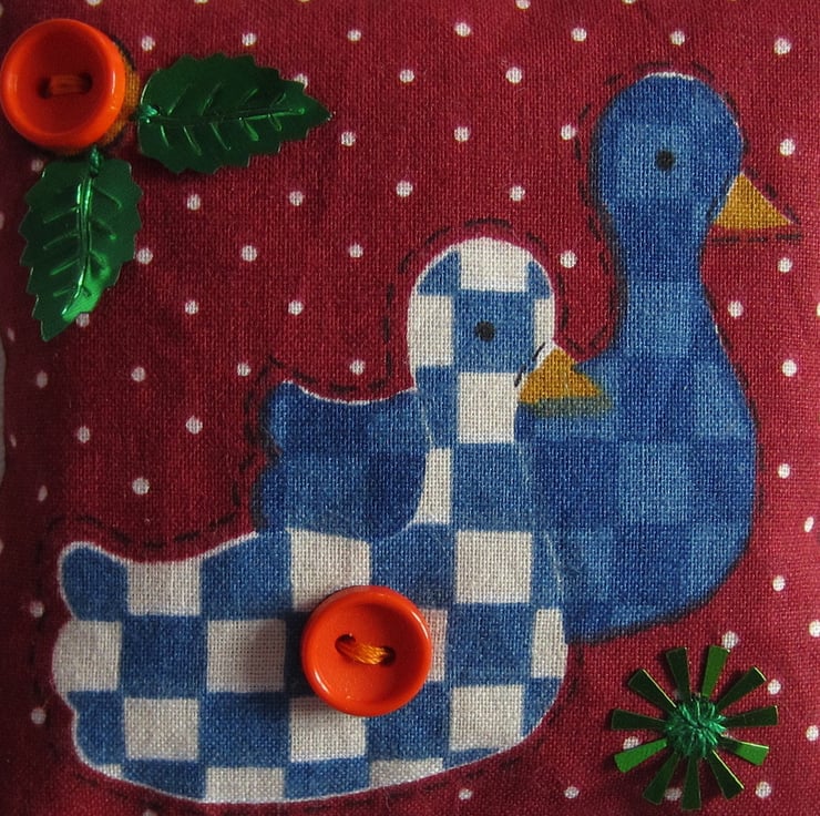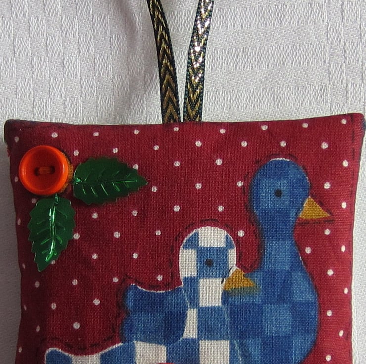 Hanging Christmas ducks decoration filled with lavender and decorated with buttons and holly and star sequins. Measures 8 x 8 cms.