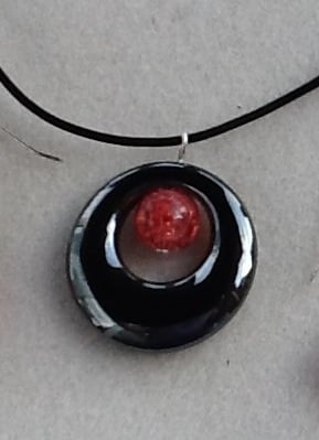 A stunning necklace consisting of a red crackle glass bead enclosed in a black hematite pendant bead frame. A leather thong completes the necklace.