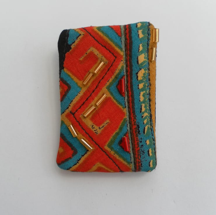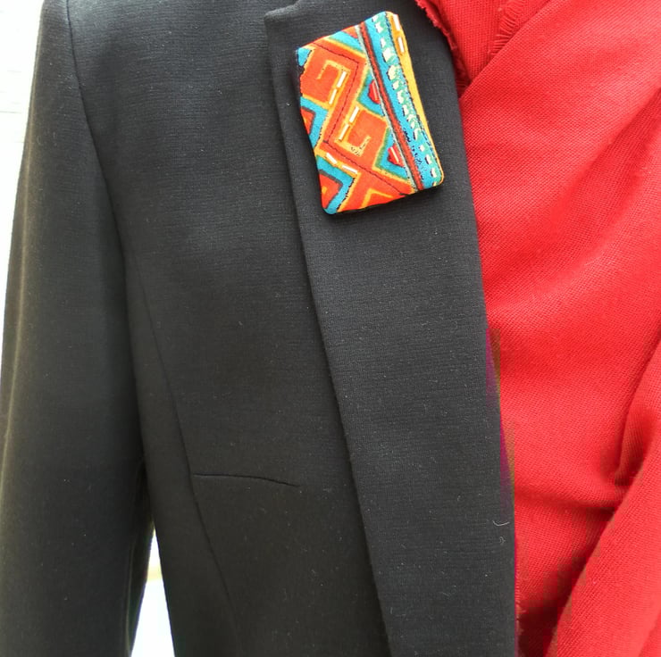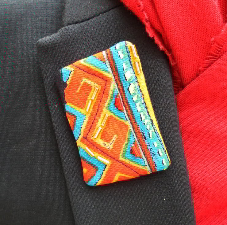 Unique statement fabric brooch, embellished with gold and red beads. It measures 3.5cm x 5.5cm and has a badge pin sewn to the back.