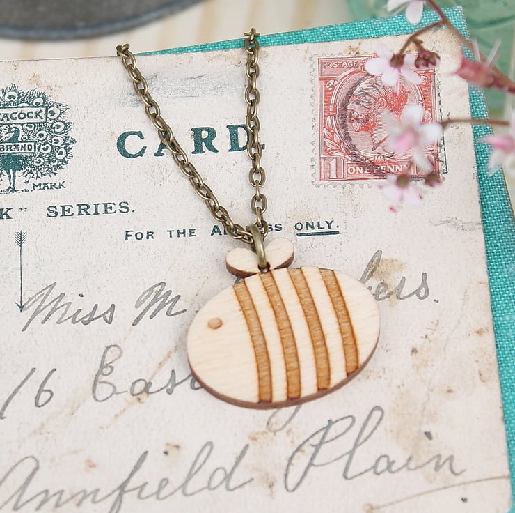 This cute wooden bumble bee necklace has been laser cut from 3mm birch plywood and swings on a dainty antique plated cable chain and closes with a lobster clasp. The bee has been coated in wood oil to protect the wood and give it a beautiful finish. The wood comes from a natural source and is FSC certified meaning it's environmentally friendly!