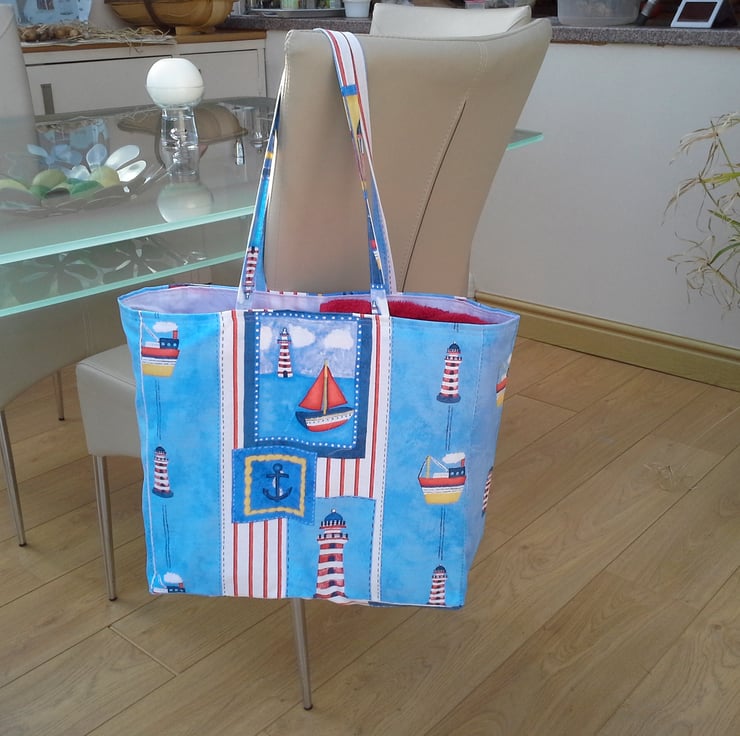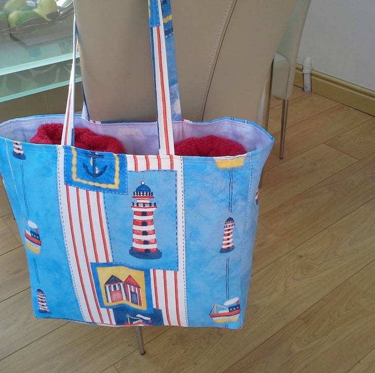 The material has a lovely holiday feeling with the beach huts, lighthouses and boats and seemed an ideal fabric to make a practical but fun beach or shopping bag.