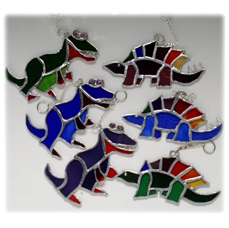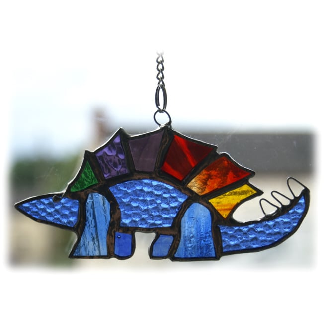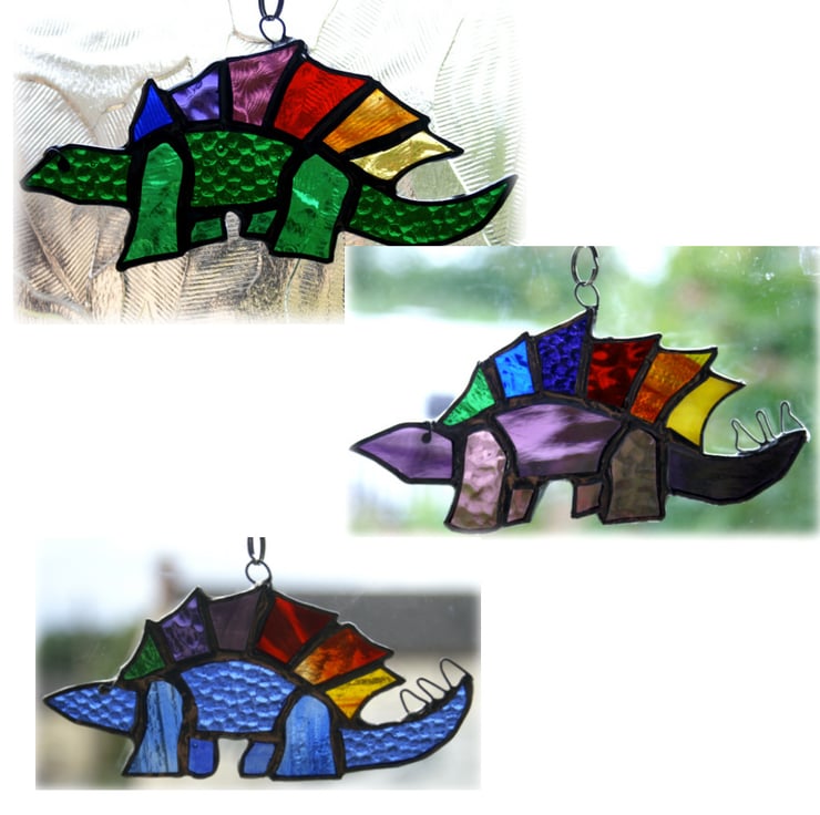 3 Rainbow Stegosaurus - with a green, blue or purple body and a back fin in 6 different shades and textures of glass which together make up the full range of rainbow colours.