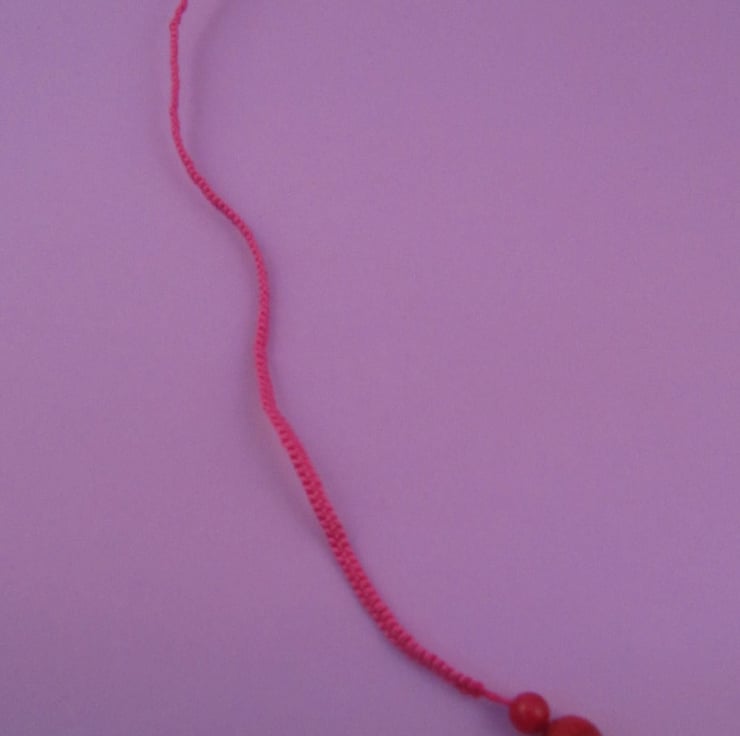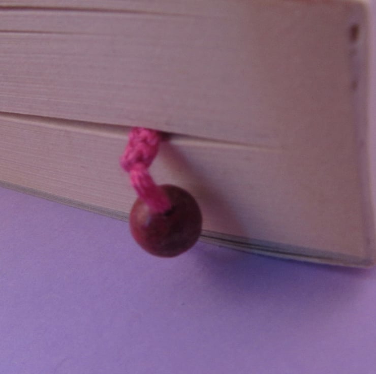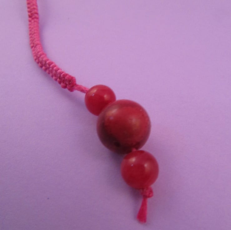 This is a beautiful pink red gemstone macrame bookmark. It is made using pink embroidery thread, and real red gemstones, possibly jasper or agate. It would make a great gift for a book lover, because it should not harm the book at all because it is so thin.