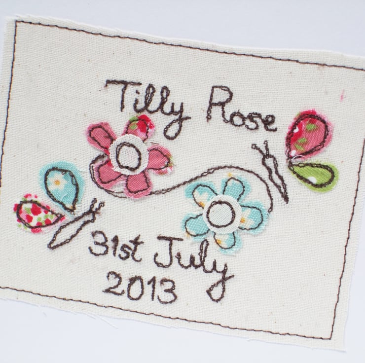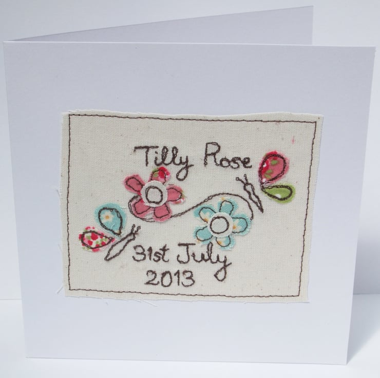 This personalised card has been freestyle machine embroidered and makes a lovely and unique card to give to the parents of a new baby. The card has the baby's name and date of birth embroidered onto it along with butterflies and flowers in beautful fabrics.
