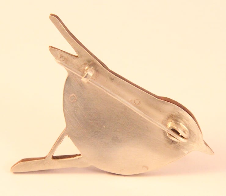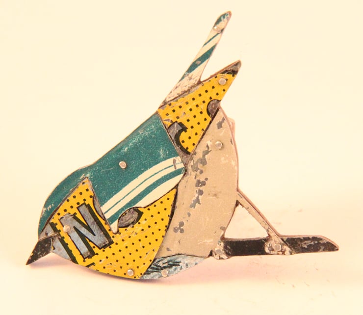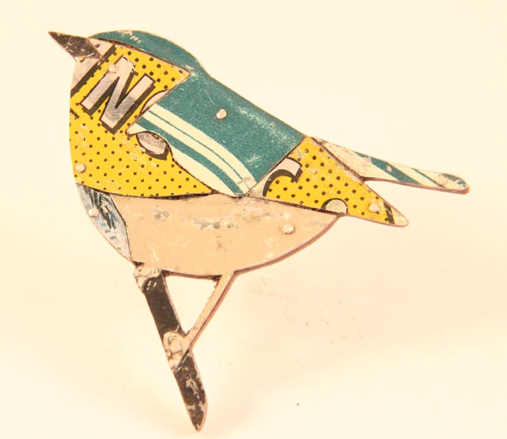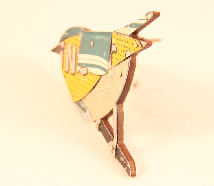 This Brooch is made by collaging old tins that I collect. Which means that each one is individual. I have a large collection of tins and sift through them all to find the right colours. I try and pick colours as close as possible to the bird. In this case a wood warbler which is a combination of yellows, greens and grey.