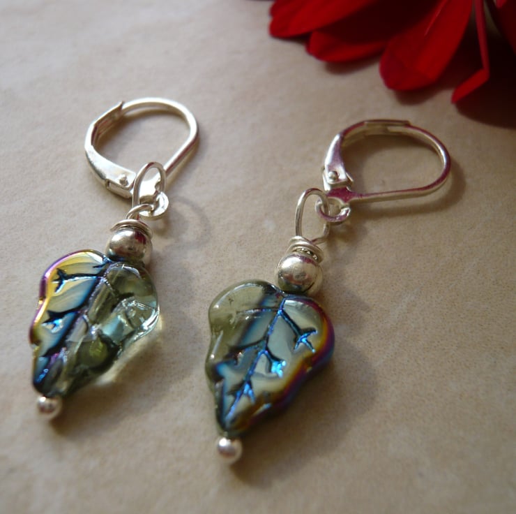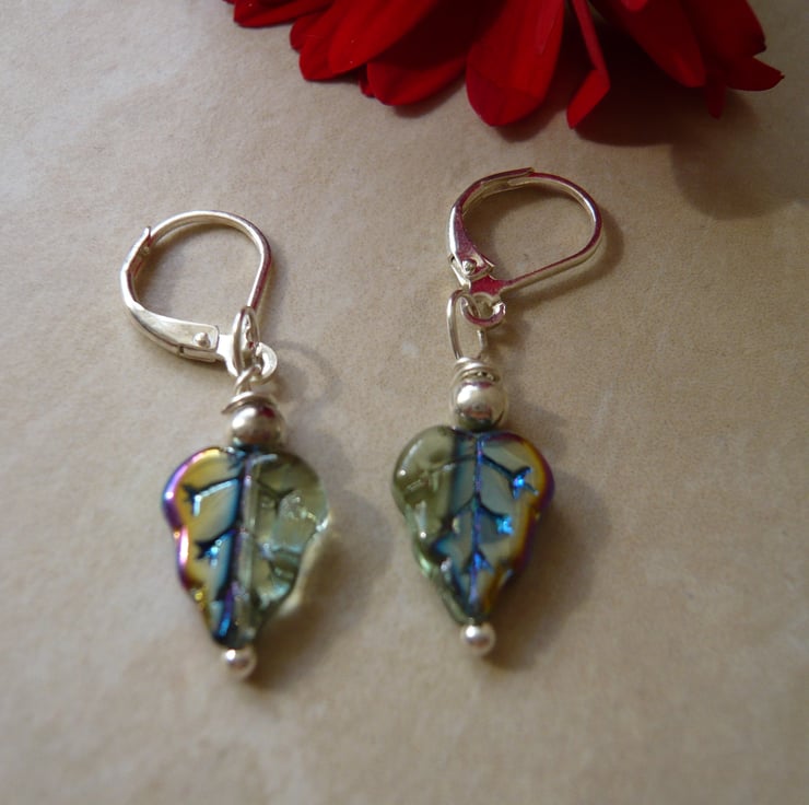 These hang from a sterling silver ear clasp and are sweet little glass beads with an iridescent look.