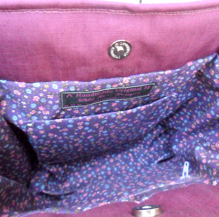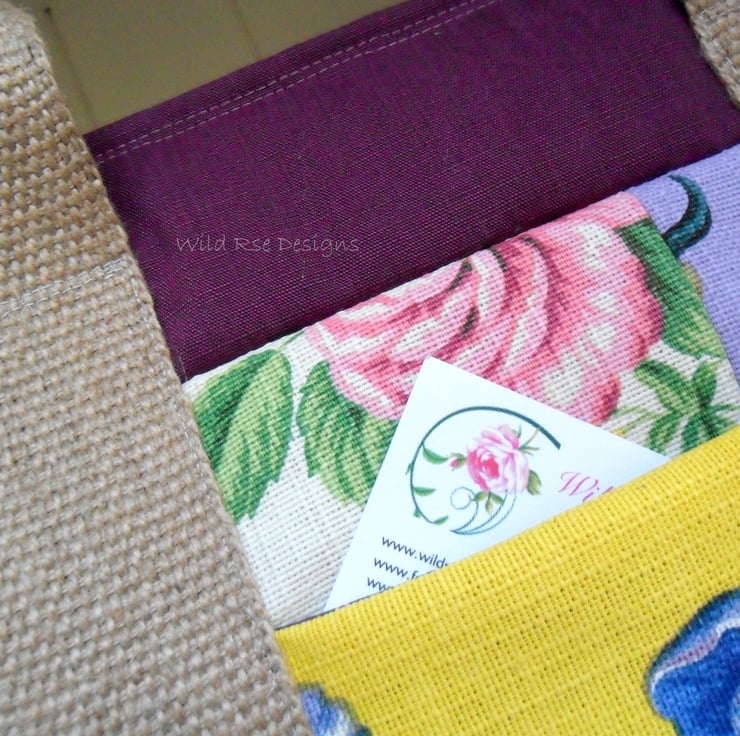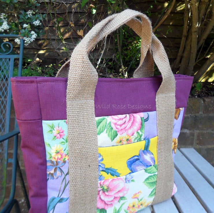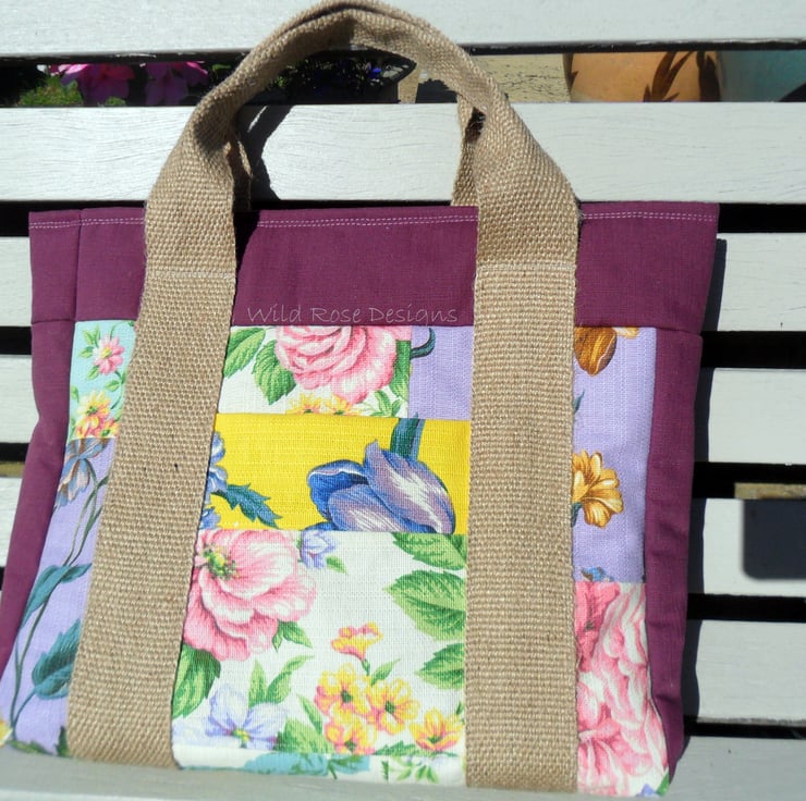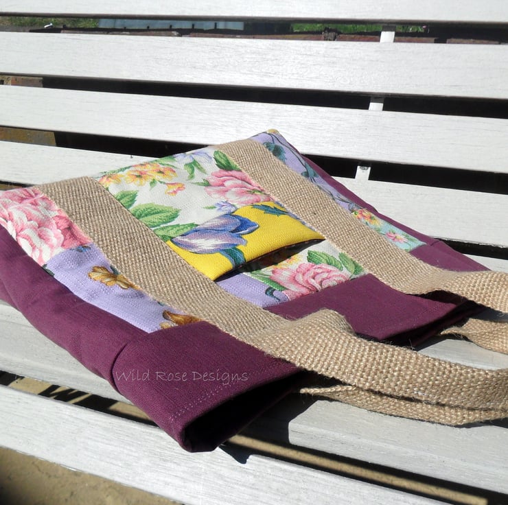 A handmade patchwork handbag with a berry coloured top trim and sides. The fabrics used in this bag are floral prints in yellow, lilac, pink and green, There is a small pocket on the front and the hessian handles are sewn to the bag all the way round, making them extra strong. Inside, the lining is a ditsy cotton print in purple and there is a zipped pocket and a slip pocket.