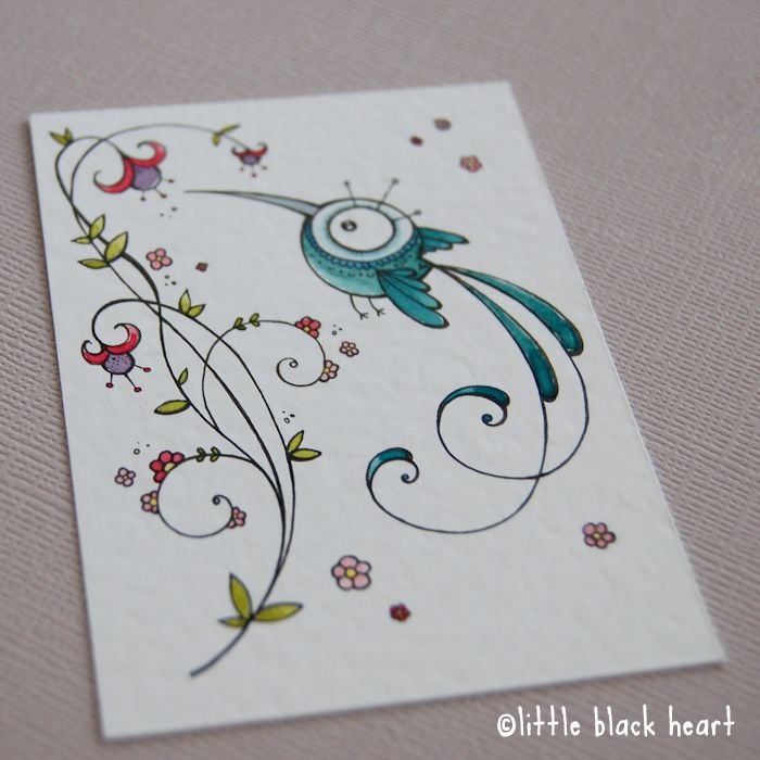 original artwork in artists pens and watercolour paints, on textured white cardstock.