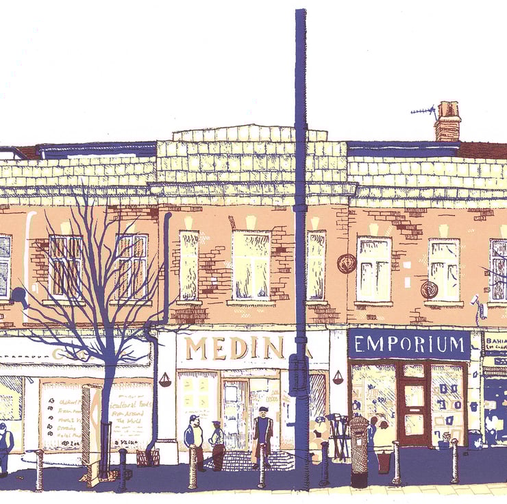 This high quality giclee print is of a screenprinted artwork by Leeds based illustrator Simon Lewis. The image is of a parade of shops on Chapeltown Road, one of many architecturally interesting shop fronts in an area that has remained occupied by local businesses rather than national chains. I particularly liked the decorative tiled frontage of this parade, using the local Burmantofts tiles that were popular in the ear. It’s a 4 colour screenprint, each colour derived from a detailed drawing to give a bright and vibrant overall image.