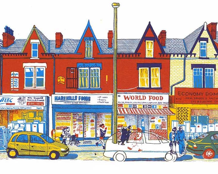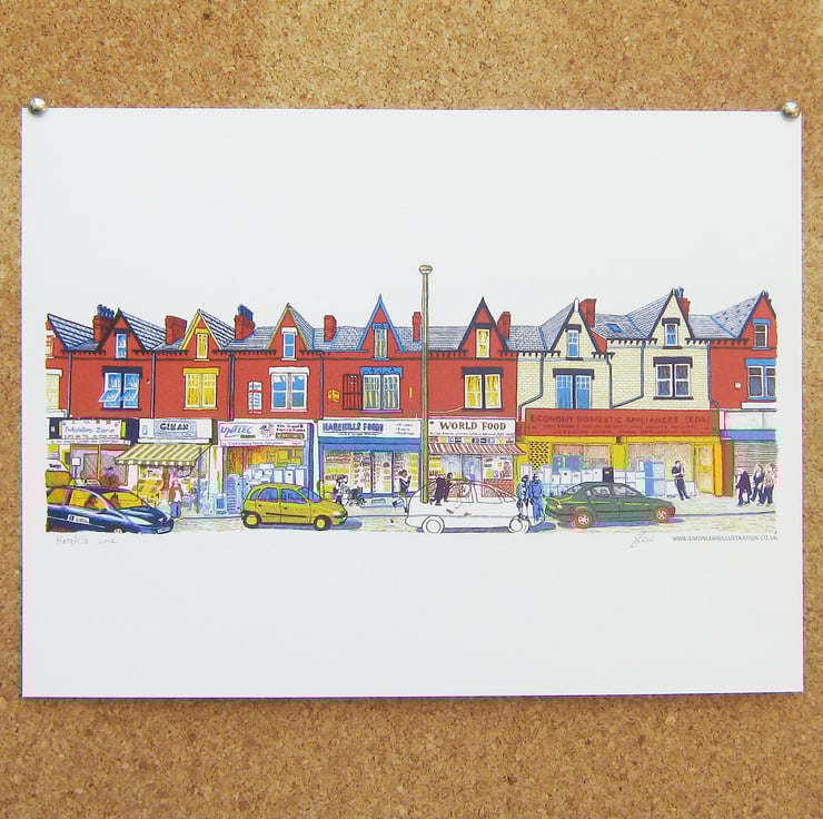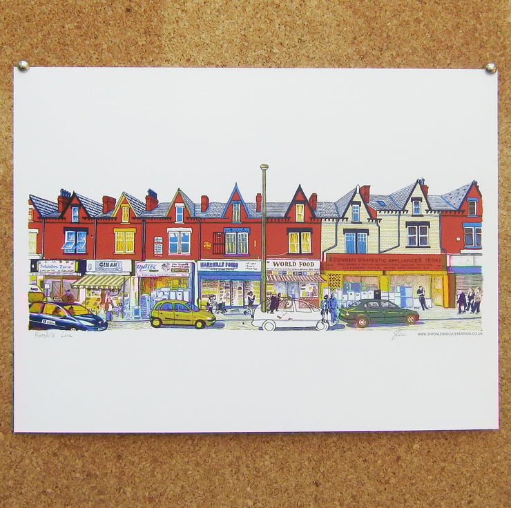 SALE! Reduced from £30 This high quality giclee reproduction print is of a screenprinted artwork by Leeds based illustrator Simon Lewis. The image is of the lively Harehills Lane in Leeds, originally produced in 2011. I was inspired by the graphic shop signage, the busyness and energy of the street, and the red brick Victorian terraces that dominate the area. It’s a 4 colour screenprint, each colour derived from a detailed drawing to give a bright and vibrant overall image.