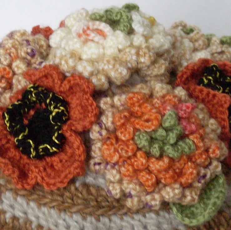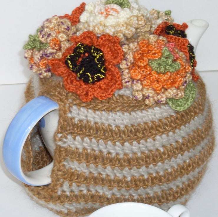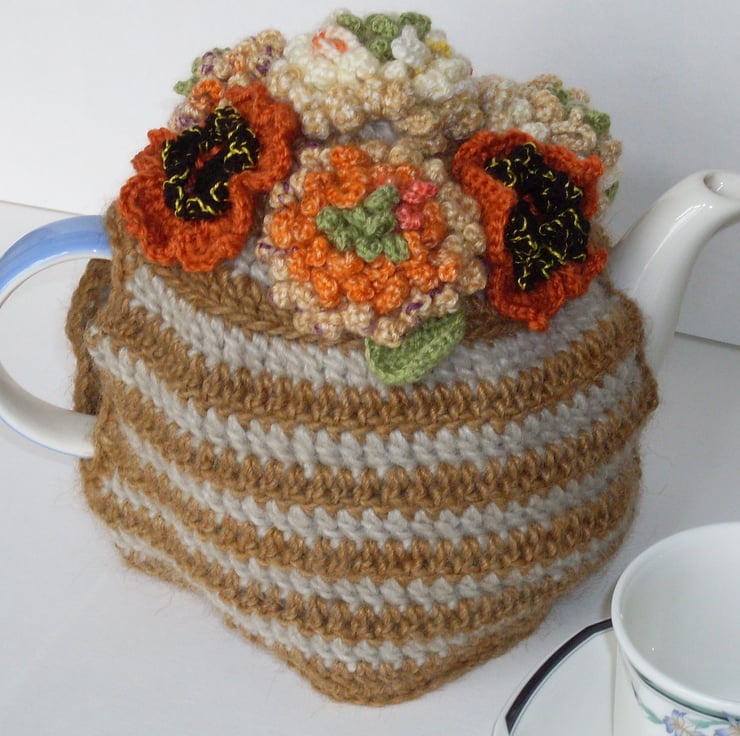 This crochet teacosy is made using thick yarn as its main material. It has a base of grey and brown hoops reminiscent of Cornish Ware. The top is covered with flowers in a variety of Autumnal shades. Give as a gift to a tea loving friend or let it take pride of place on your tea table.