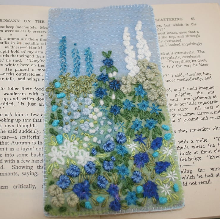 Sky blue wool fibers have been felted to a background of 'eco' felt (produced from recycled plastic bottles). Textured, hand-dyed wool tops, some of them with lovely curls, have been felted in clumps to represent the planting. Stitching in fine cotton has been added to the sky to 'stabilise' the felting. Simple embroidery stitches, cotton threads, crewel, tapestry and knitting wools, have been used to create more foliage and the pretty flowers.