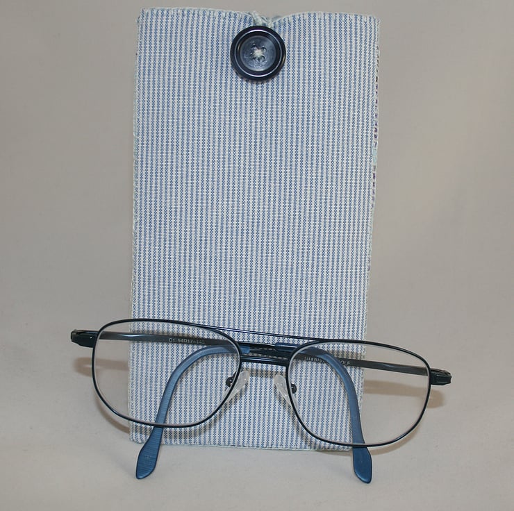 The case is lined with a printed turquoise fabric, backed with iron-on interfacing. The case closes with a button-hole stitched loop, in a pale blue crochet cotton, over a blue button.