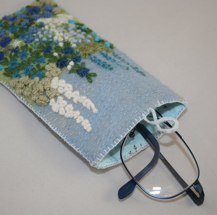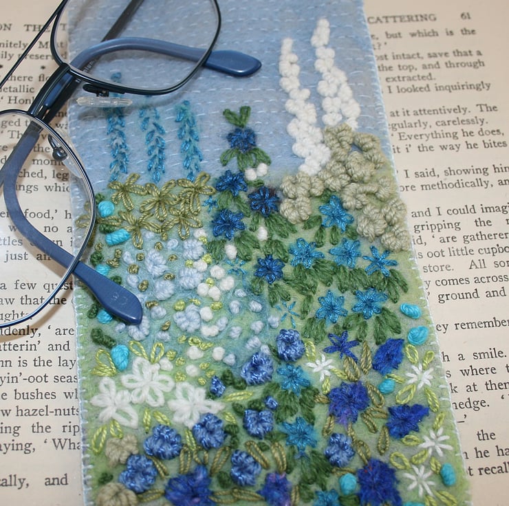 An embroidered and felted garden design decorates the front of this glasses case.