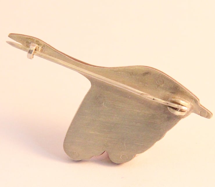 This brooch is inspired by the Swan. One of the largest European birds. These vegetarians mate for life and are known for their strong family ties. Mute cygnet swans hitch a ride on Mum or dad's back for their first ten days. This bird when sensing danger ruffles his feathers and heads straight towards the problem
