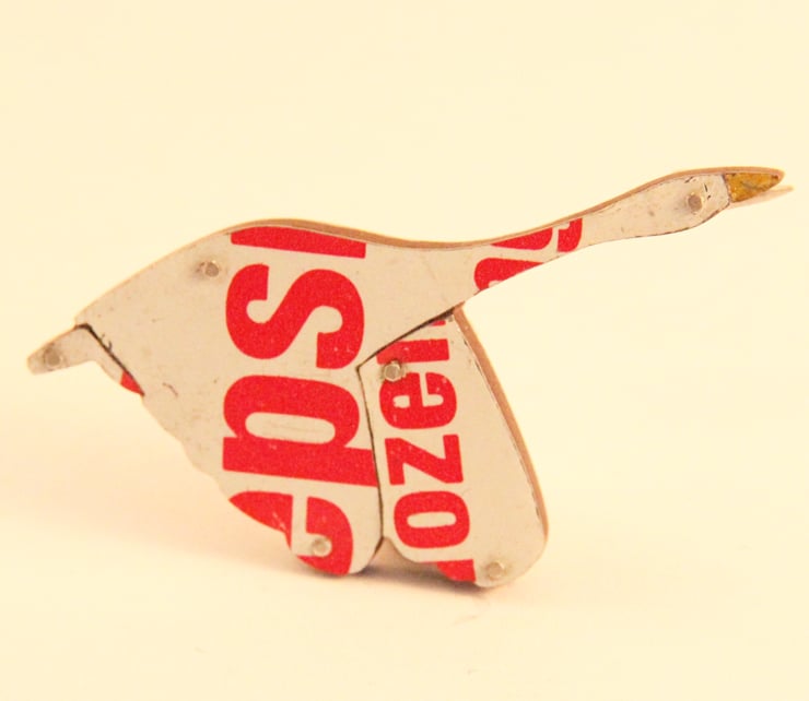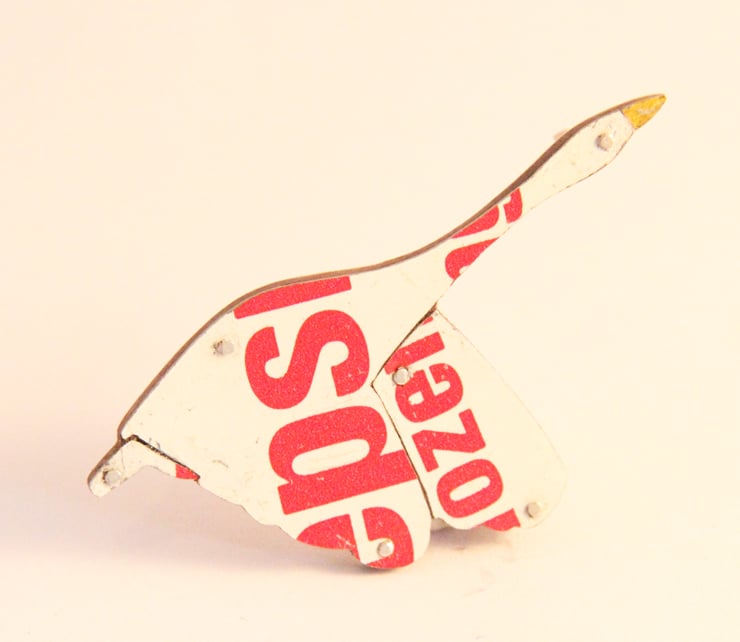 This Brooch is made by collaging old tins that I collect. Which means that each one is individual. I have a large collection of tins and sift through them all to find the right colours. I try and pick colours as close as possible to the bird. In this case a Swan, which is a snowy white with an orangey beak. Each piece is cut out with my piercing saw and filed so it fits properly.